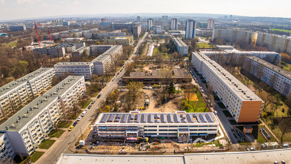 Foto: Blick aus der Vogelperspektive auf die Baustelle.