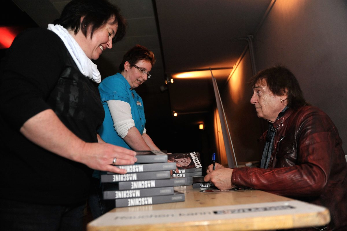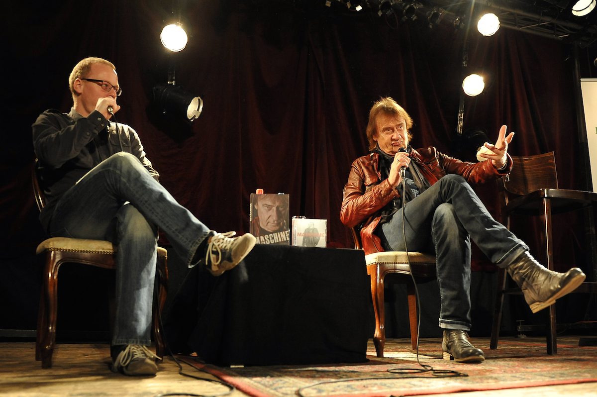 Wie kam es zum Buch, ist das erste Thema, dann geht es mit der Borreliose weiter. Dann tauchen beide tief in die Vergangenheit ab. Maschine erzählt von seinem ersten Instrument, einem Akkordeon. Wie er die Lust an dem schweren Kasten verlor und endlich seine erste Gittere bekam. Ein irres Gefühl, fühlte er sich doch seinen Idolen nah. „Elvis Presley mit Gitarre sah ja auch entschieden besser mit Gitarre als mit Akkordeon aus“, feixt er auf der Bühne. Sein Publikum freut sich mit ihm.