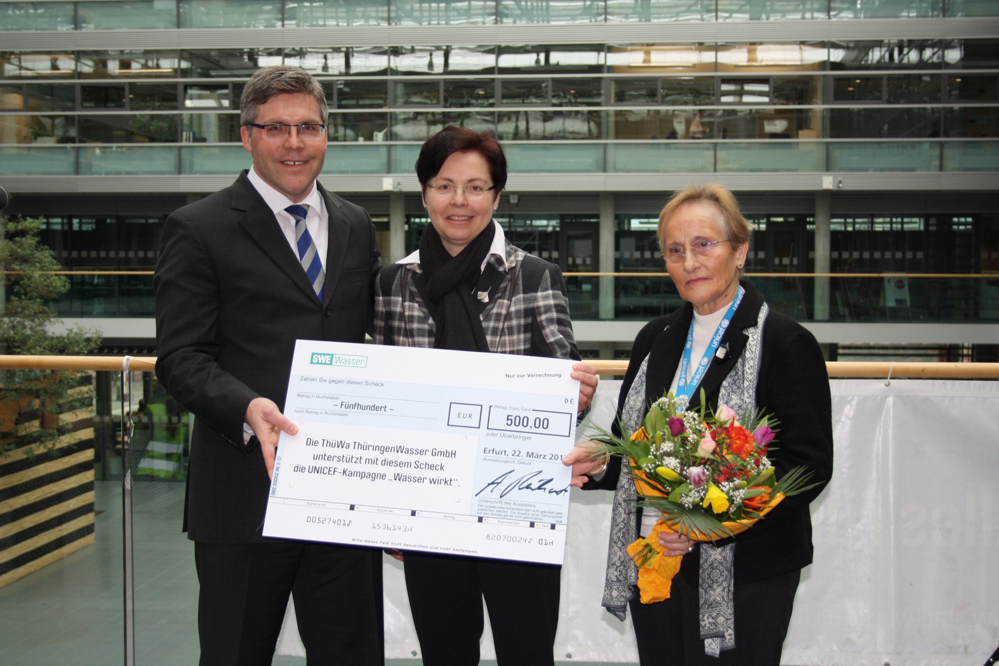 „Sauberes Wasser ist keine Selbstverständlichkeit. Darauf möchten wir gemeinsam mit UNICEF hinweisen“, erklärte Andreas Reinhardt, Geschäftsführer der ThüWa ThüringenWasser GmbH, zur Eröffnung der Ausstellung. Um die Kampagne zu unterstützen, überreichte er im Namen der ThüWa einen Scheck über 500 Euro an Ute Schreck von der UNICEF-Gruppe Erfurt.