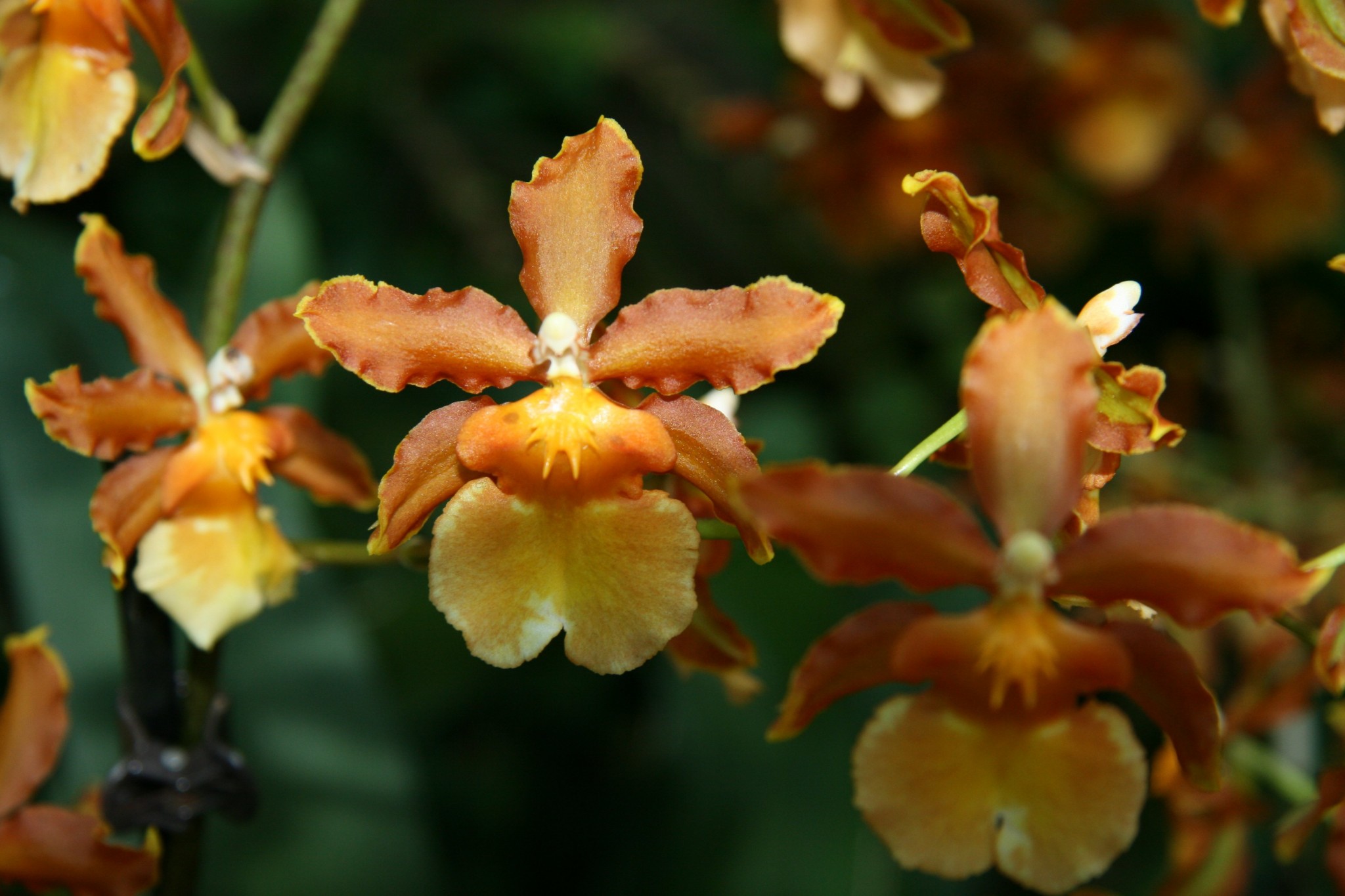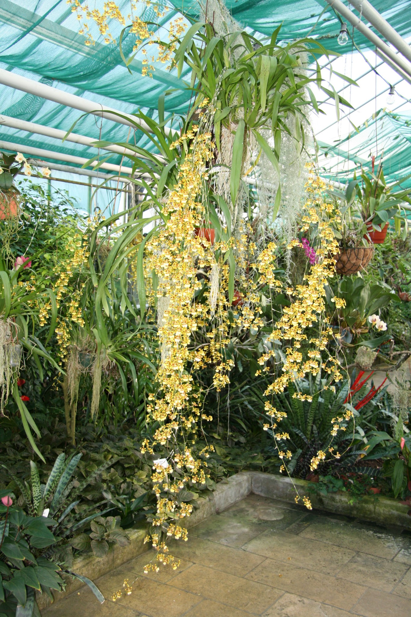 Im Orchideenhaus in den Pflanzenschauhäusern im ega-Park sind gerade einige Orchideen in sehr beeindruckender Blütenpracht. Über 2,0 m lang hängen die Blütenrispen einiger Oncidium Sorten herab, und sind überreich mit gelben oder bräunlichen Blüten übersät. Bei diesen Oncidium handelt es sich um alte Sorten, die heute kaum noch im Handel sind. Denn für den privaten Bereich ist diese Blütenpracht einfach zu groß.