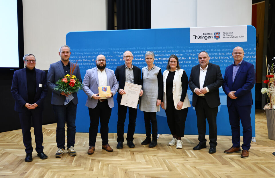 Foto: Von l.n.r.: Holger Reinhardt, Landeskonservator, Matthias Bärwolff, Beigeordneter für Bau, Verkehr und Umwelt, Arne Ott, Leiter des Amtes für Gebäudemanagement, Torsten Köppe, gildehaus.partner architekten mbB BDA, Heike Gläßner, Amt für Gebäudemanagement, Lea Sprengler, gildehaus.partner architekten mbB BDA, Prof. Dr. Steffen Teichert, Staatssekretär für Wissenschaft und Kultur und Jörg Klinge, Sparkassen-Kulturstiftung Hessen-Thüringen bei der Preisverleihung.