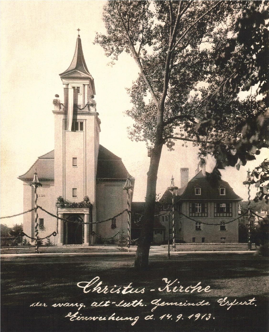 Ausgehend von den Erfahrungen der Napoleonischen Kriege verfasste König Friedrich-Wilhelm III. am im September 1817 einen Aufruf zur Vereinigung der Lutherischen und Reformierten Kirchen in Preußen. Er und seine Berater hielten die bestehenden Lehrunterschiede für geringfügig. Dagegen regte sich insbesondere in den Lutherischen Kirchen Widerstand. So bildeten sich unter anderem in Erfurt aus Bekenntnisgründen eigenständige Lutherische Gemeinden. Die sogenannten Altlutheraner hatten in der Folge in Erfurt im Zeitraum 1836-1845 heftige Auseinandersetzung mit dem Staat, in deren Folge 1839 etwa 90 Gemeindemitglieder unter Führung des Pfarrers Grabau nach Amerika auswanderten. Die verbliebenen Gemeindemitglieder wurden über Jahre an der Ausübung ihres Glaubens behindert, obwohl namhafte Persönlichkeiten zu ihr gehörten. Der Mühlenbesitzer Filss, der Kaufmann Jacobskötter und der Bau- und Fuhrunternehmer Rothe seien als Beispiel genannt. Letztgenannter war es auch, der sich als Gönner und Förderer erwies, um einen eigenen Kirchenbau verwirklichen zu können. Er stiftete sowohl das Grundstück als auch drei Glocken. Der Architekt Max Brockert fertigte den Entwurf und in nur zwei Jahren wurde sie 1912/1913 errichtet.