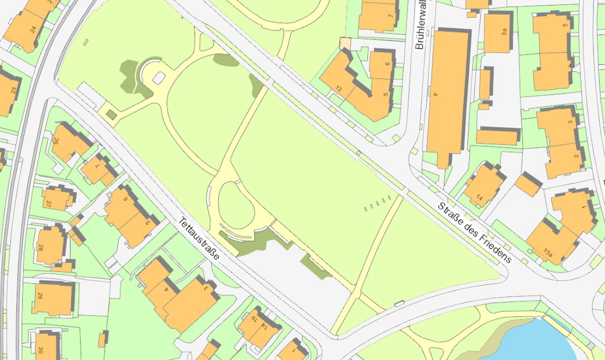 Die Tettaustraße ist nur einseitig bebaut, denn auf der Ostseite erstreckt sich eine Parkanlage mit einem herrlichen Kinderspielplatz. Diese Anlage zwischen Tettaustraße und Straße des Friedens, verbunden mit der Parkanlage am Benaryplatz bestand schon vor dem Bau des Flutgrabens. Sie ist ein historischer Beleg für den Glacisbereich der äußeren Wallanlage. Während des Flutgrabenbaus erhöhte man die Parkanlage um zirka 50 cm mit dem Aushub und Flussschlamm aus der Gera. Die baumbestandene Parkanlage ist eines der wenigen noch vollständig erhaltenen Teilstücke der ehemaligen Wallanlagen. Dieser Park ist eng mit dem Namen Ernst Benary verbunden, der der Stadt diese Flächen vermachte, verbunden mit der Auflage, sie niemals zu bebauen. Wer weiß, ob die Tettaustraße sonst noch immer nur einseitig bebaut wäre.